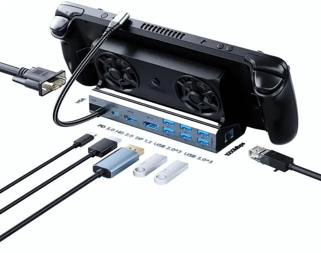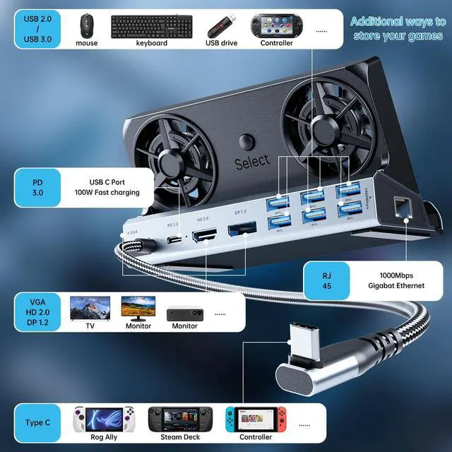 YOUGO LEE 11 in 1 steam deck dock .Support PD 100W charging port, ensure that your gaming device can always have a continuous power output, to add points to your gaming experience.The docking station for steam deck, There is an output port for HDMI 2.0 4K@60Hz,It meets the requirements of the game for high-resolution display and provides a clear and smooth visual experience. SD/TF dual card slots have also been added, allowing you to read more of your stored games.Network fast connection: 1000Mbps Ethernet port, not only can quickly and stably let you experience the joy of the game, but also can greatly reduce the game latency, show your top gametechnology.The two USB 3.0 and three USB 2.0 ports also make it easy to add additional hardware devices.The whole body of this steam deck dock is made of aluminum alloy shell, which is not only durable, but also has good heat dissipation, Additional upgrades include dual fans to help dissipate heat from your gaming devices more effectively. ensuring that your docking station for steam deck will be used for a longer time.The added fan has separate switches, while equipped with 24 color random changes, widening the bottom groove to allow the console and steam deck dock The gap is larger, and the fan heat is better.