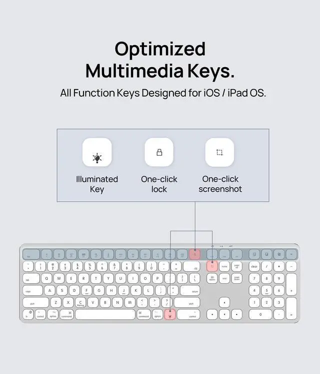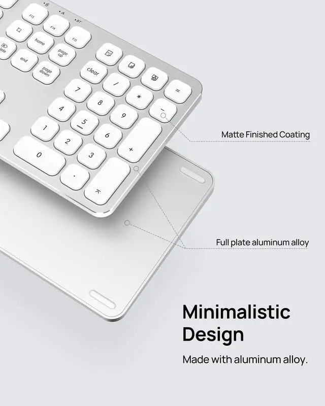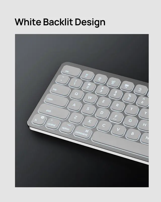 KB036 Wireless Keyboard for Mac Premium Typing Redefined Elevate your Mac workflow with the KB036 wireless keyboard, blending inspired aesthetics with professional functionality. Designed exclusively for macOS/iOS devices, this full-sized 110-key keyboard features a sleek aluminum body with matching Apple finishes and a built-in numeric keypad for seamless data entry. Enjoy effortless connectivity via Bluetooth with MacBooks, iMacs, iPads, and iPhones (macOS 10.12.4+/iOS 10.3+). The scissor-switch keys deliver quiet, fatigue-free typing with 1.5mm travel distance, while 3-level backlighting ensures comfortable use in any lighting. Key advantages: 27 dedicated Mac shortcuts for screenshots, volume, backlight control, and more 200-hour battery life with USB-C charging and auto-sleep mode Ultra-slim aluminum design (just 0.8lbs) for clutter-free workspaces Plug-and-play Bluetooth pairing ready in seconds Perfect for designers, writers, and office professionals seeking a premium alternative to Apple keyboards. Includes USB-C cable and 12-month warranty. Note: Not compatible with Windows/Android devices.