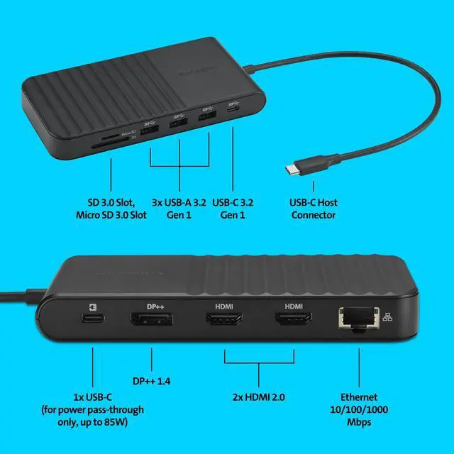 Offering a smart and sustainability-focused 11-in-1 design, it uses your laptop's USB-C (r) power adapter or battery for charging to eliminate an additional power brick and provides plenty of data ports so you can streamline the movement of files without the need for additional adapters or dongles. Features
