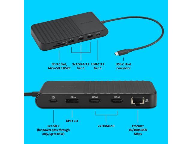 - 11-in-1 Design with 5 USB Ports: Optimize peripheral connectivity with 3 x USB-A 3.2 Gen1 ports, 2 x USB-C ports (one for power-pass through and one for device charging), UHS-I SD3.0 Micro and SD card slots, 2 x HDMI and 1 x DP video connections, and 1 x Gigabit Ethernet port