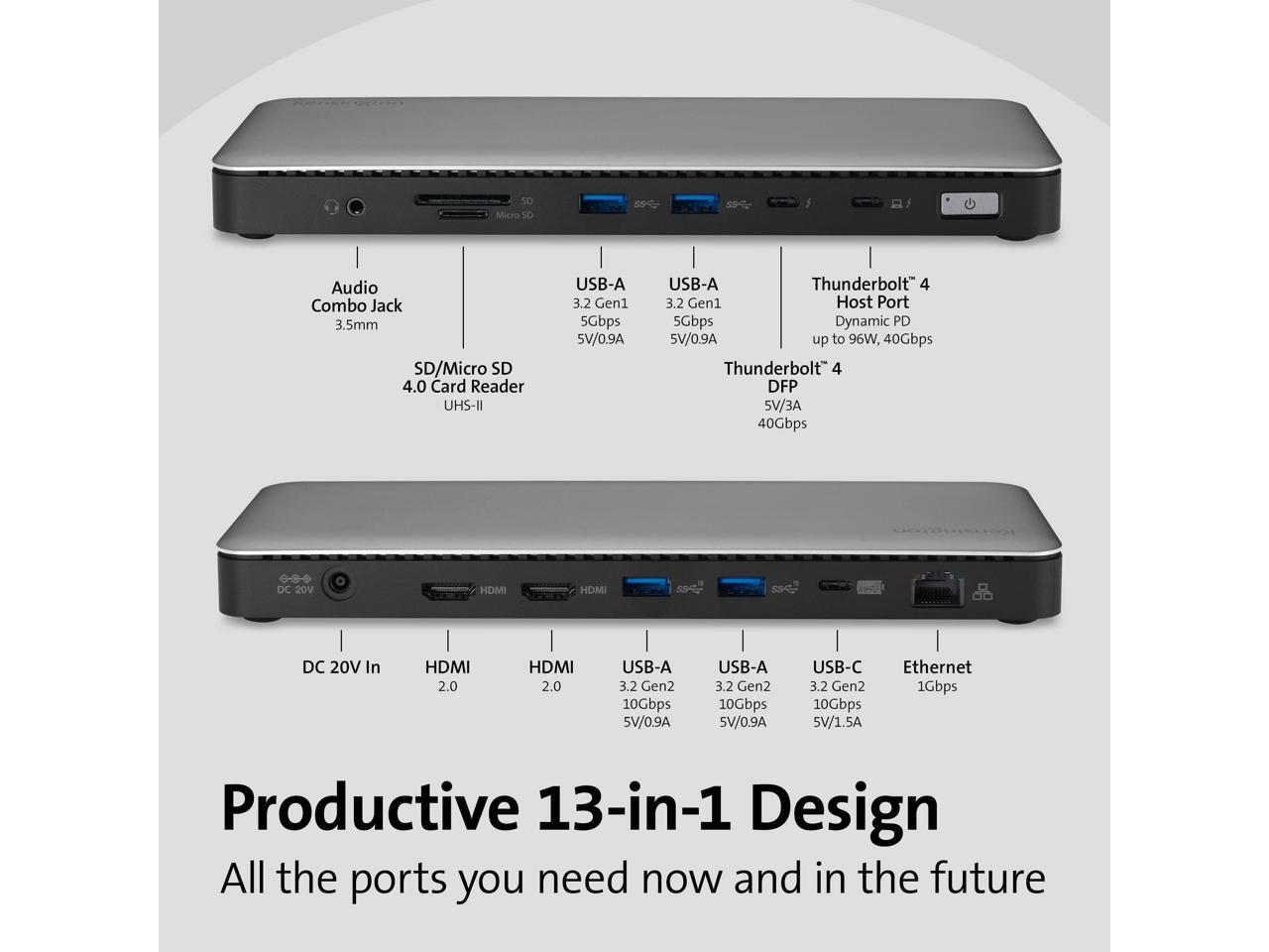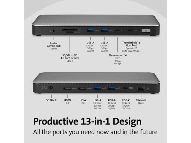 - Extend your productivity with two HDMIports, one Thunderbolt 4 port, oneThunderbolt 4 host port, one USB-C 3.2Gen2 10Gbps port, two USB-A 3.2Gen2 10Gbps ports, two USB-A 3.2Gen1 5Gbps ports, one GigabitEthernet port, one audio combo jack,and two UHS-II 4.0 SD and Micro SDcard readers