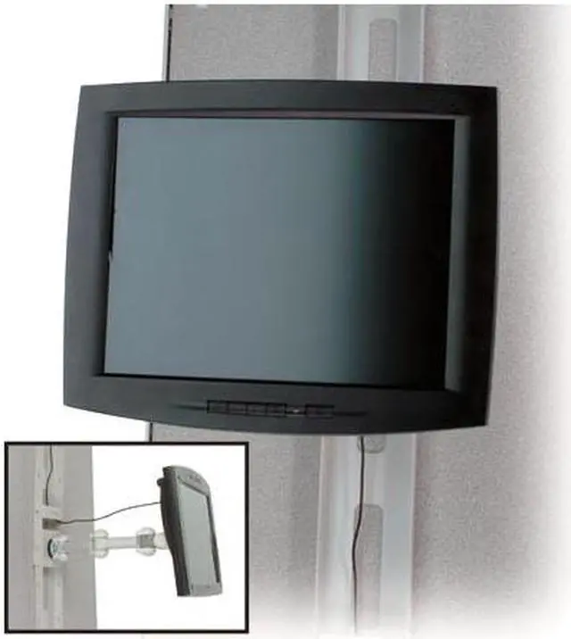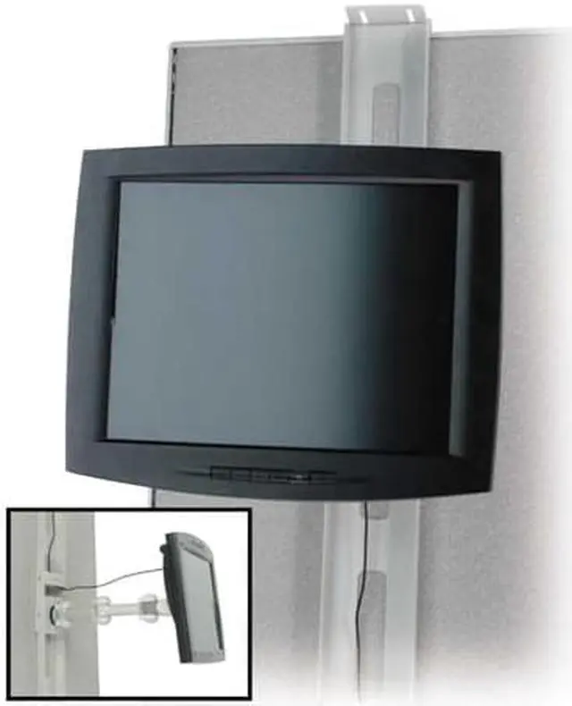 The monitor hanger takes flat panel off the desktop and attaches it from the cubicle wall. Height, reach, and tilt all adjust for viewing comfort. Hanger saves desktop space by attaching flat panel display to cubicle wall.