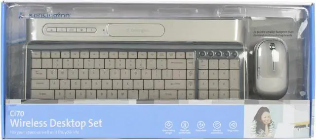 Finally, a no-compromise wireless keyboard and mouse. Kensington presents its Ci70. It has all the bells and whistles you expect a 103–key standard keyboard and all the multimedia function buttons you could ask for. Multimedia hot keys provide intuitive, one-button control of audio and video playback, and hot keys for calculator functions help speed you through your day. Convenient USB connectivity gets you up and running fast.