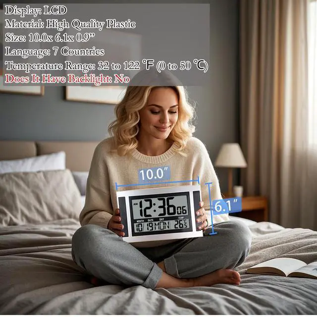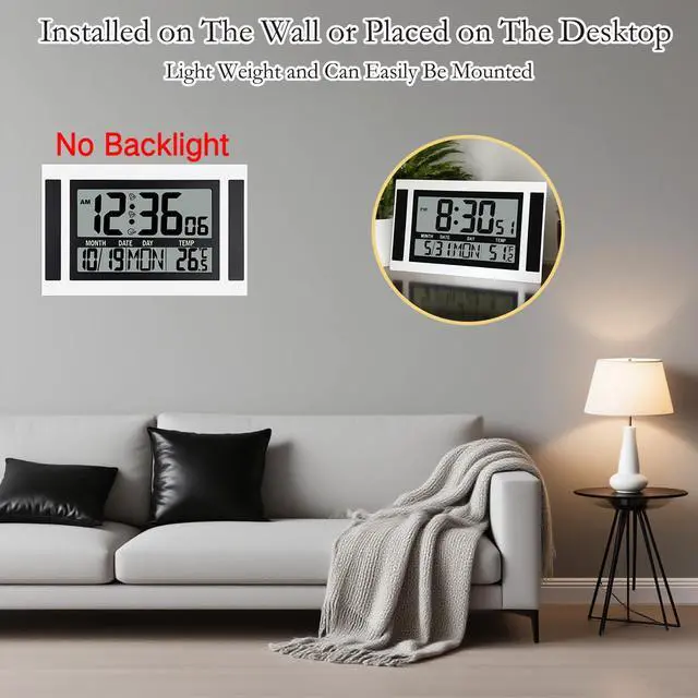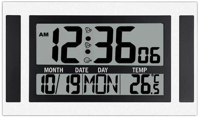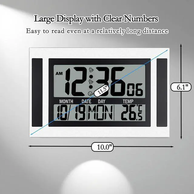 Clear Display: The large, high-definition LCD screen features big, bold numbers that are easy to read from any angle, and you'll always have a clear view of the d igital clock for w all or desk.
