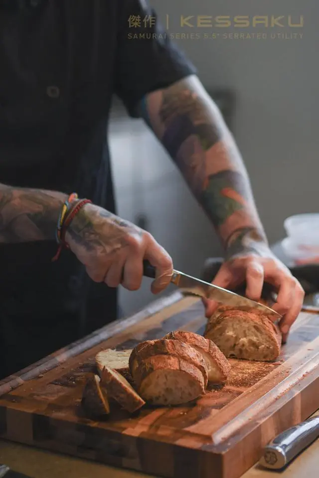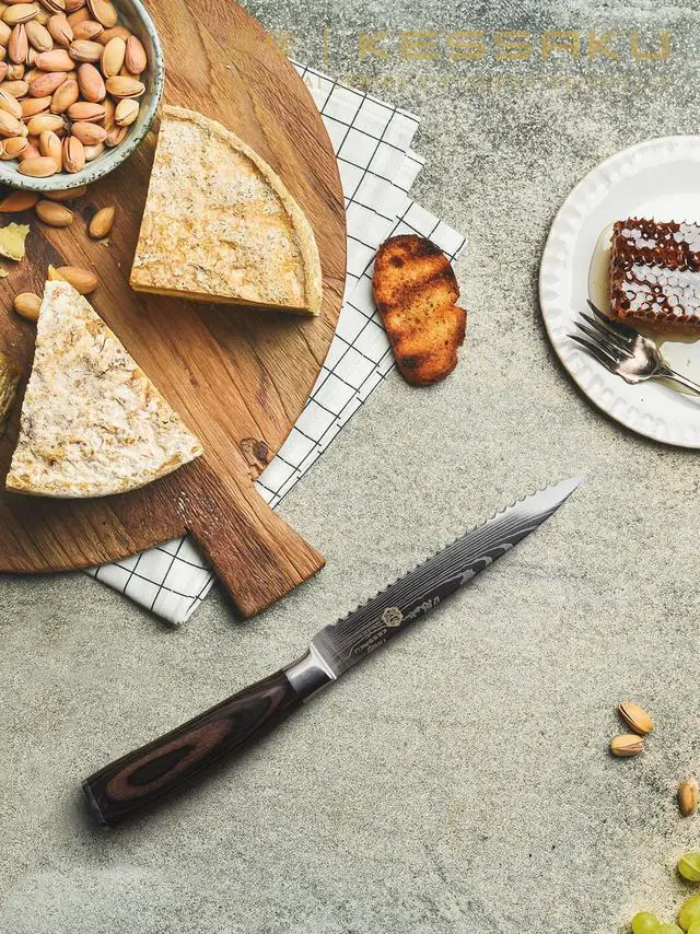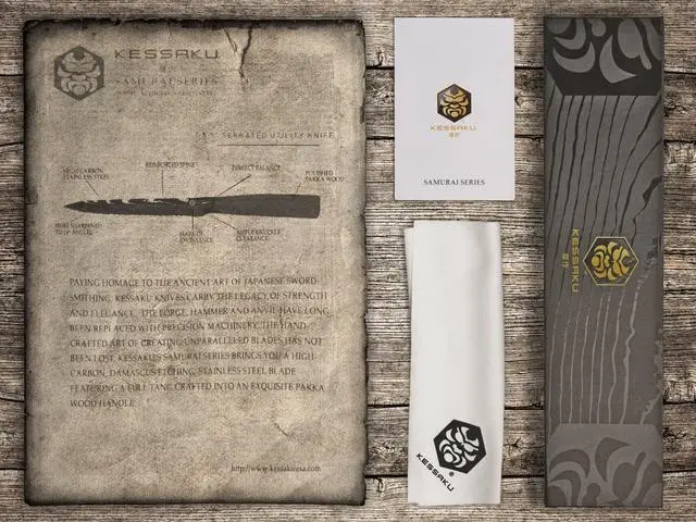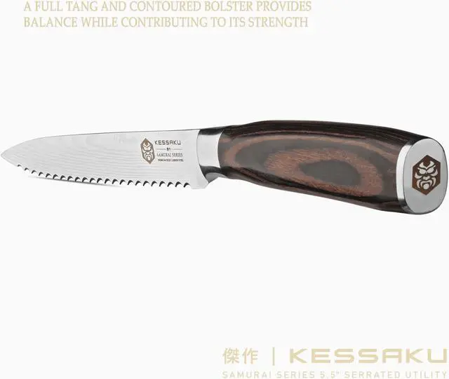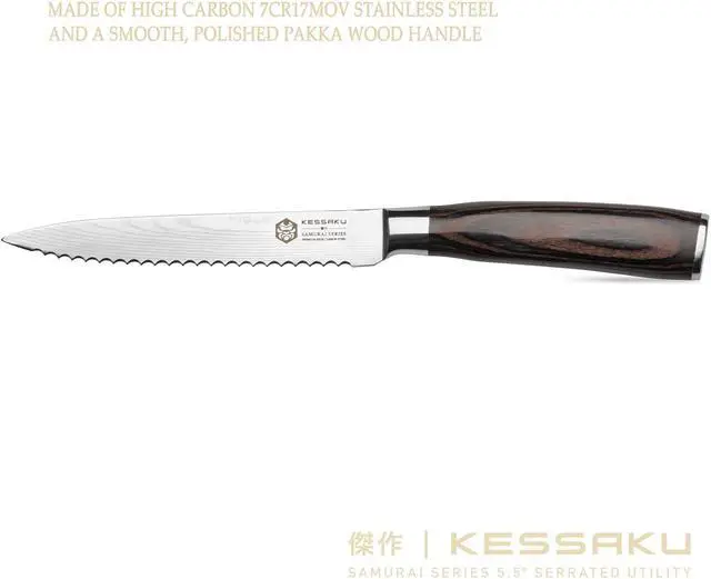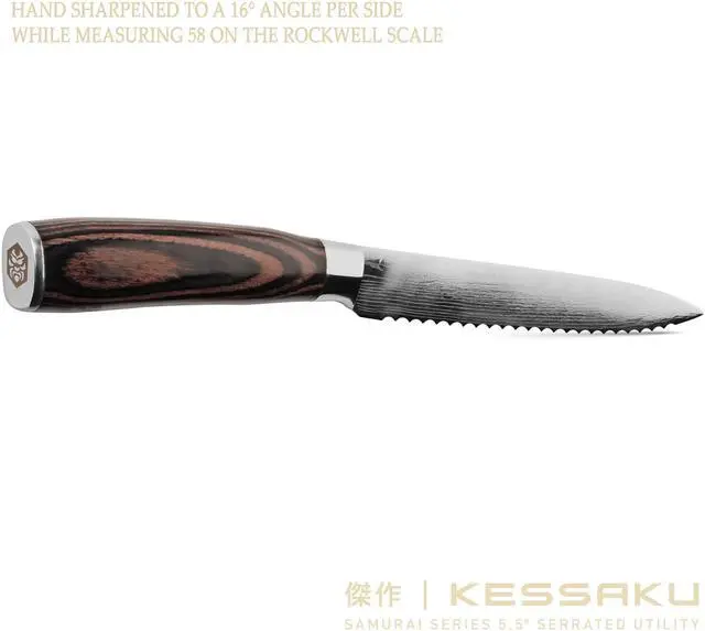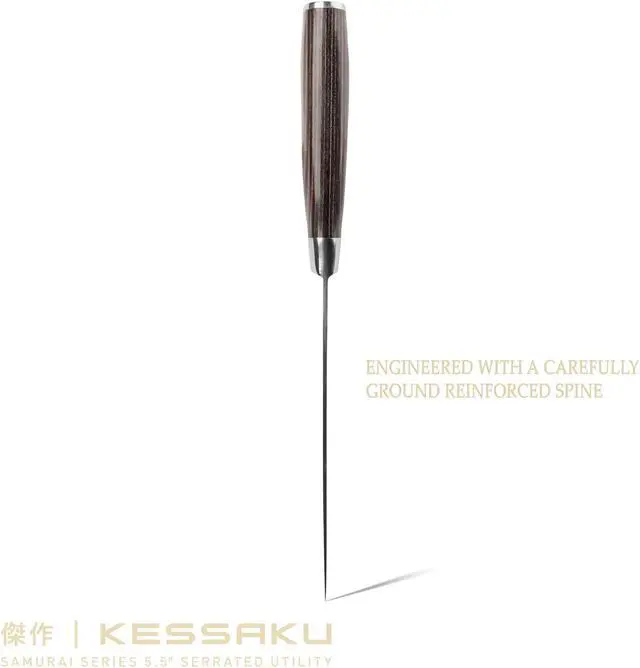 The Kessaku Samurai Series 5.5" Professional Serrated Utility Knife will be a staple in your kitchen and will become one of your favorite knives. The knife is constructed by hand of a high carbon 7CR17MOV stainless steel, has a 58+ Rockwell hardness and is very resistant to corrosion and rust. The mirror polished, smooth Pakkawood handle offers superior strength, while its sanitary build ensures no dirt or debris collects. The handle is heat, cold and moisture resistant and is constructed utilizing a full tang. The razor sharp blade is hand sharpened using the Honbazuke method to a 16 degree angle per side and is well balanced so you won’t feel dragged down. The knife’s ergonomics helps reduce the chance of experiencing aches and fatigue in your hands. Remember to hand wash your knife then wipe and dry clean. Stainless steel, although stain and rust resistant, is not impervious to water.