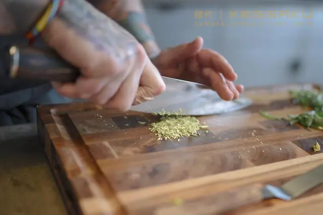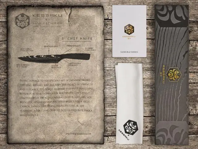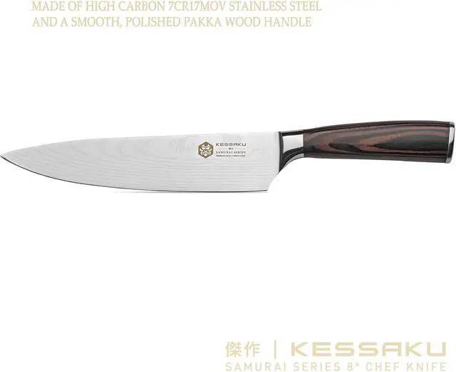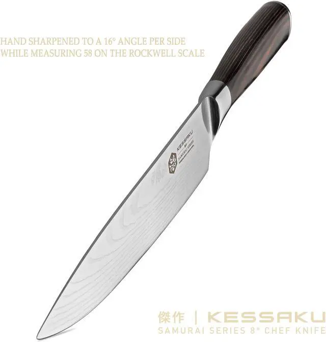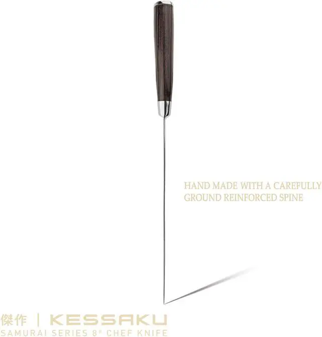 The Kessaku Samurai Series 8" Professional Chef Knife will be a staple in your kitchen and will become one of your favorite knives. The knife is constructed by hand of a high carbon 7CR17MOV stainless steel, has a 58+ Rockwell hardness and is very resistant to corrosion and rust. The mirror polished, smooth Pakkawood handle offers superior strength, while its sanitary build ensures no dirt or debris collects. The handle is heat, cold and moisture resistant and is constructed utilizing a full tang. The razor sharp blade is hand sharpened using the Honbazuke method to a 16 degree angle per side and is well balanced so you won’t feel dragged down. The knife’s ergonomics helps reduce the chance of experiencing aches and fatigue in your hands. Remember to hand wash your knife then wipe and dry clean. Stainless steel, although stain and rust resistant, is not impervious to water.