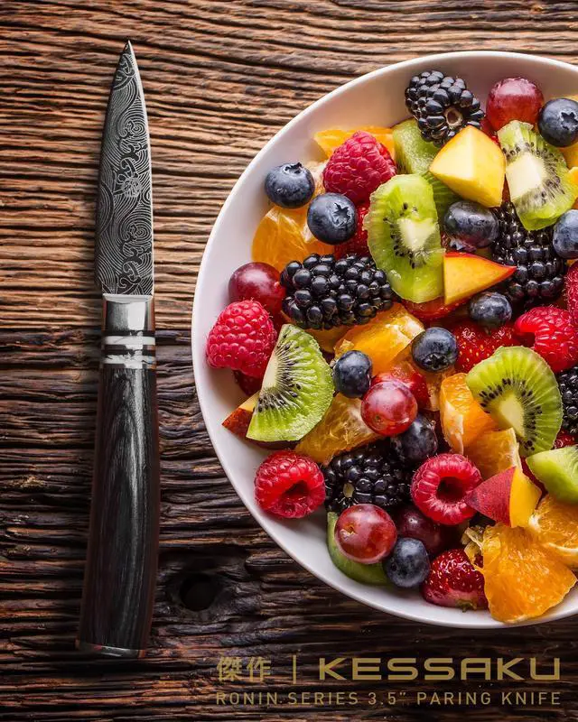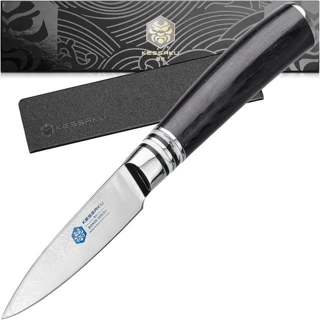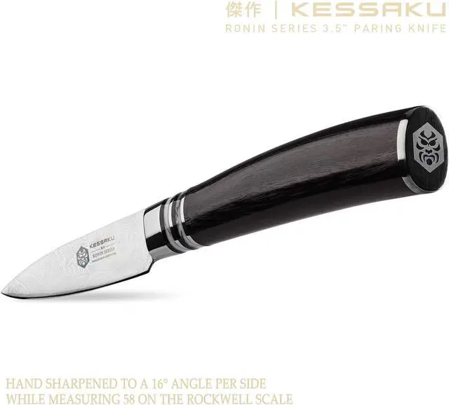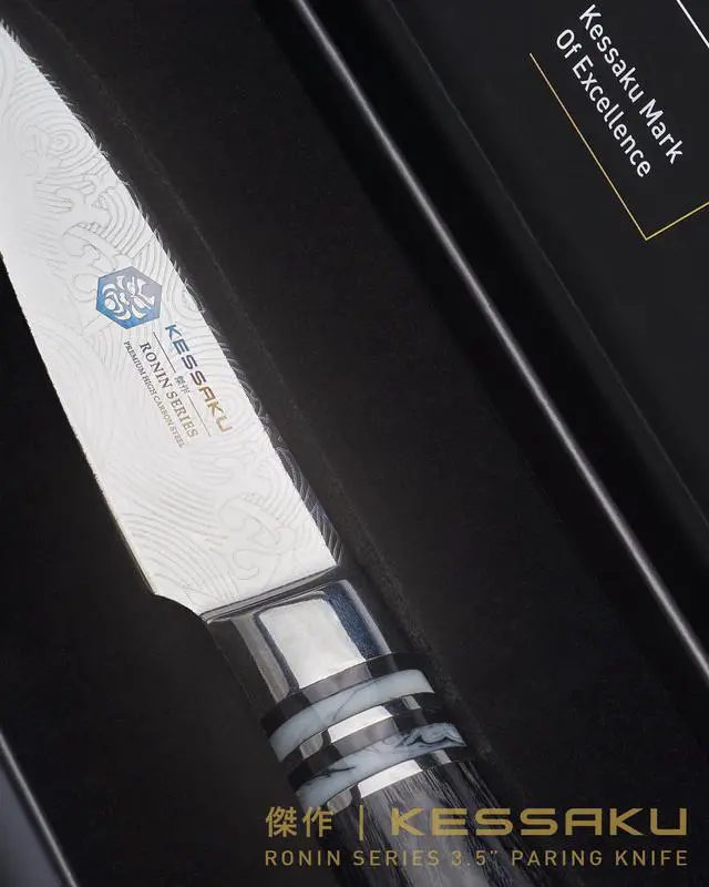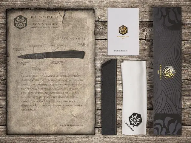 Astonishingly formidable with unparalleled craftsmanship, our Ronin Series knives were crafted to reflect centuries of traditional Japanese knife design, along with cutting-edge forging techniques. Stylish & gorgeous, these knives will draw the eye in any kitchen! Ferociously sharp & made from high carbon 7Cr17MoV Stainless Steel for greatly enhanced corrosion & rust resistance. It's Precision Forged, Nitrogen Cooled blade is individually handcrafted & hand-sharpened by our technicians in the traditional Japanese 3-stage Honbazuke method to 16° per side for clean, precise, cuts, amazing edge-retention, with a Rockwell Hardness of 58 for maximum strength, flexibility, & blade edge durability. Our mirror polished, smooth pakka wood handle with resin inlays is impact-resistant, & nearly impervious to heat, cold, & moisture, while its seamless build ensures no debris can ever infiltrate its body. Ergonomically designed with ample knuckle clearance for superior control & agility, triple-rivet construction, and Full Tang Strength for a lifetime of safe & precise use.