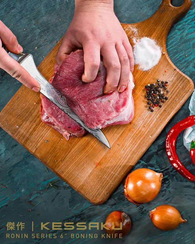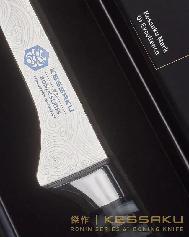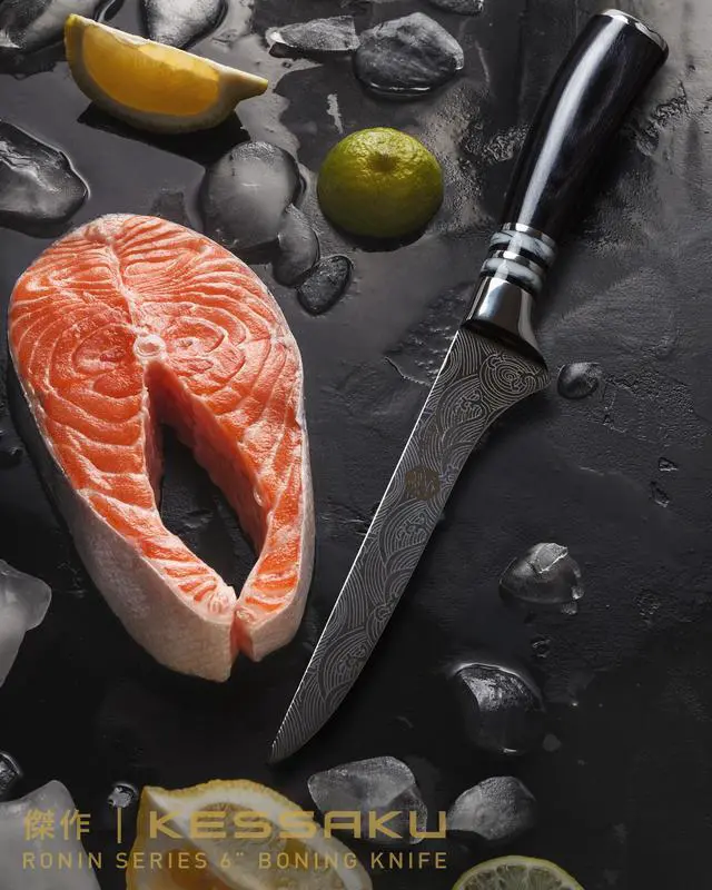 Astonishingly formidable with unparalleled craftsmanship, our Ronin Series knives were crafted to reflect centuries of traditional Japanese knife design, along with cutting-edge forging techniques. Stylish & gorgeous, these knives will draw the eye in any kitchen! Ferociously sharp & made from high carbon 7Cr17MoV Stainless Steel for greatly enhanced corrosion & rust resistance. It's Precision Forged, Nitrogen Cooled blade is individually handcrafted & hand-sharpened by our technicians in the traditional Japanese 3-stage Honbazuke method to 16° per side for clean, precise, cuts, amazing edge-retention, with a Rockwell Hardness of 58 for maximum strength, flexibility, & blade edge durability. Our mirror polished, smooth pakka wood handle with resin inlays is impact-resistant, & nearly impervious to heat, cold, & moisture, while its seamless build ensures no debris can ever infiltrate its body. Ergonomically designed with ample knuckle clearance for superior control & agility, triple-rivet construction, and Full Tang Strength for a lifetime of safe & precise use.
