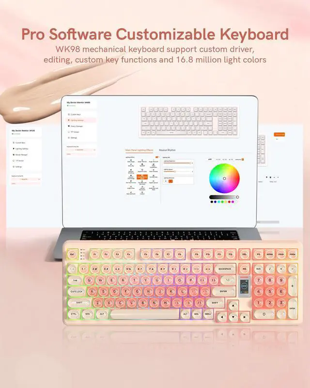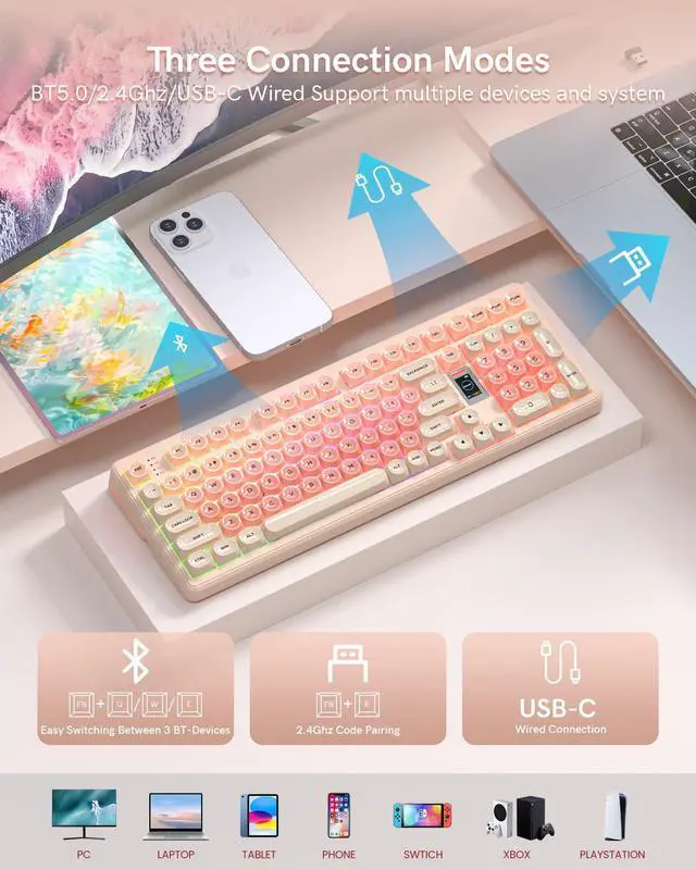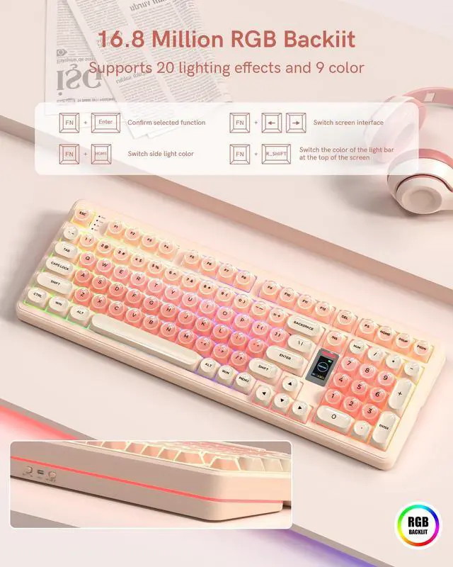 98% Pink Creamy Keyboard Gaming Keyboard,3 Mode with Multimedia Screen,RGB Backlit,Jelly MOA Profile keycaps for Win/Mac,Pink