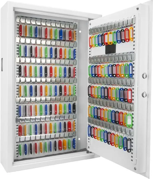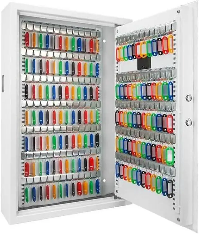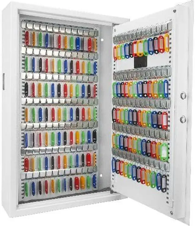 Constructed from durable solid steel, this wall safe features 144 numbered hooks, each capable of holding multiple keys. The hooks are complemented by color-coded key tags that can be labeled for quick and easy key identification, making this safe an ideal choice for environments where efficient key management is crucial.