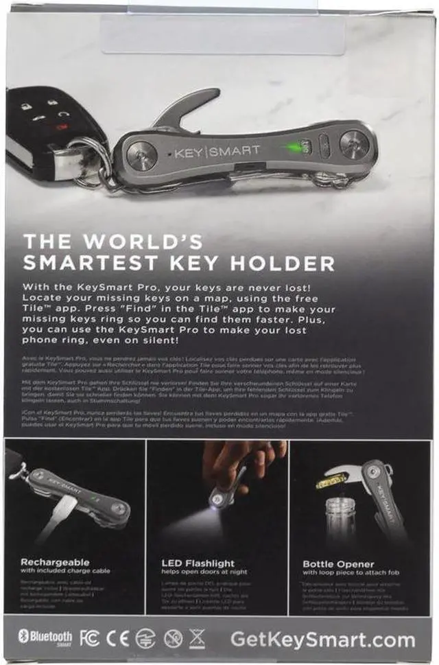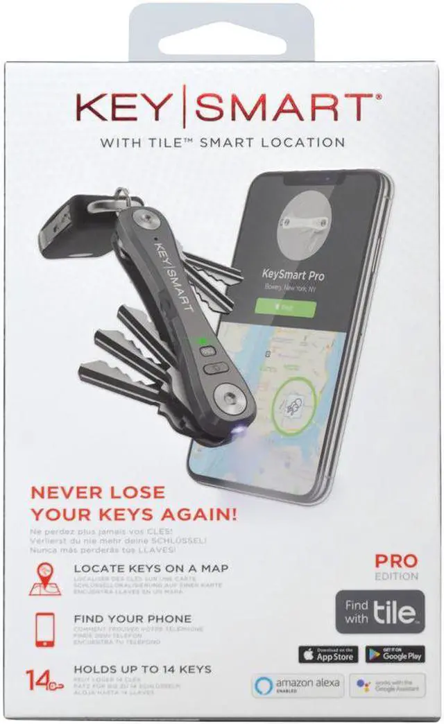 The Keysmart Pro Smart Key Organizer with Tile Location Tracking allows you to easily track your keys with your phone using the free Tile app. Make your missing keys ring for easy finding, and make your lost phone ring even when it's on silent! The Keysmart Pro accommodates up to 10 of your existing keys. It also includes an ultra-bright LED flashlight and bottle opener. Lightweight and discreet, easy assemblyPair with the free Tile app on your smart phone to track your keysMake keys ring to find them fasterMake lost phone ring, even on silentRechargeableFits up to 10 of your existing keysLoop piece allows you to attach larger itemsIncludes ultra-bright LED flashlight and bottle opener