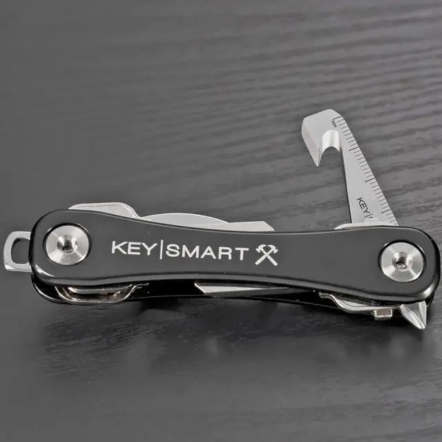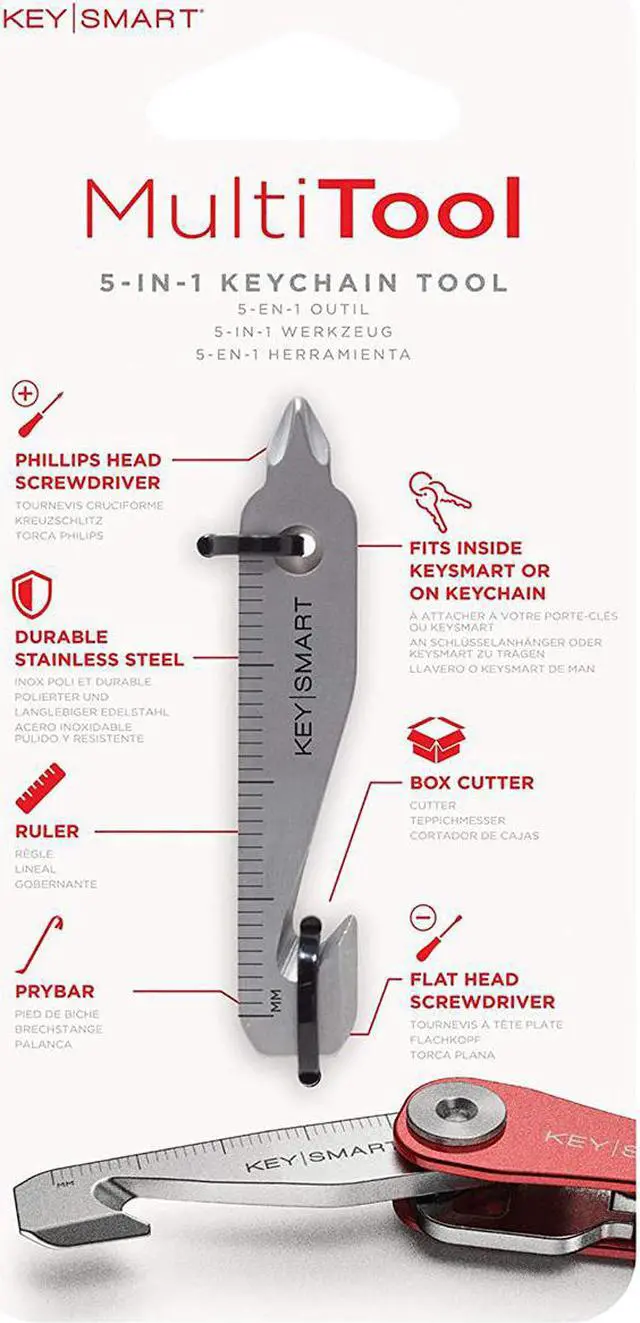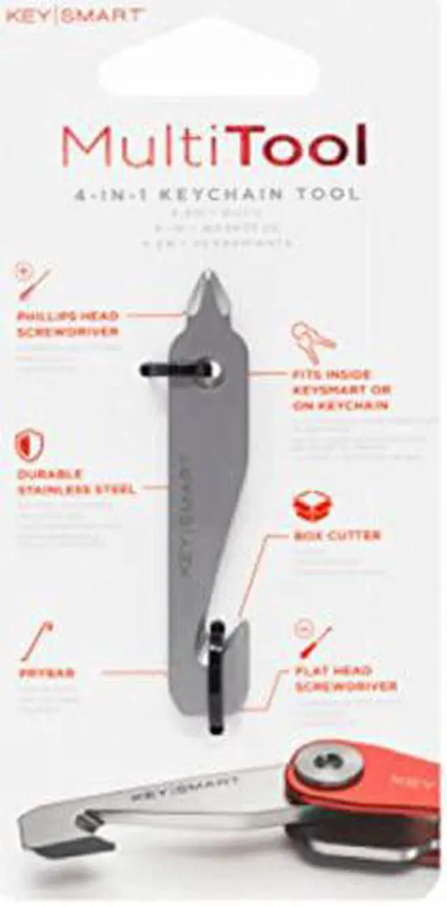 The KeySmart Stainless Steel 5-in-1 Keychain Multi-Tool combines powerful tools into one slick gadget that fits seamlessly inside your Keysmart or on your keychain. The five tools that are featured are a box cutter, Phillips head screwdriver, flat head screwdriver, pry bar and ruler. This is the perfect portable toolbox that is great for the home or office. Quickly cut, tighten or pry on the go! 5-in-1 Multi-ToolEasily attach to your keychain, Keysmart or lanyardPortable, convenient, and lightweightDurable stainless steel constructionBox cutter, Phillips head screwdriver, flat head screwdriver, pry bar, rulerMeasures 2.39" x 0.44" x 0.13"