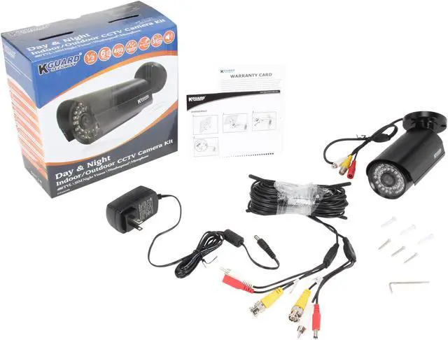 | Features | Effective pixels: NTSC 768(H) x 494(V) PAL 752(H) x 582(V) Viewing Angle: 50 Degrees Video Output: 1.0VP-P,75 ohms S/N Ratio: More than 52dB(AGC OFF) Day / Night Mode: Color during day / switches to B&W at night Minimum Illumination: While Infrared LED ON 0 lux Gain Control: Auto Backlight Compensation: Auto Audio: Microphone: Built-In Audio Pick-up Range: Up to 5m / 16ft Night Vision: Night Vision Distance: 35m/115ft Illumination: Infrared LED Infra-Red Wavelength: 850nm Infra-Red LED Life: 10,000hrs Indoor / Outdoor: Weatherproof (Both) Body Construction: Aluminum Camera Dimension: 199x70x75mm / 7.8x2.8x3 in Weight - Camera with Stand: 340g / 0.75 lbs. 1/3 Color CCD image sensor to provide you excellent colorful image. 480 TVL resolution to make the video clear. 6mm Fixed Lens with 50 degrees viewing angle to monitor particular areas. Equipped with Internal Wire Bracket to Prevent from Cutting by Vandals. Waterproof case to protect the camera and survive rainy days. Useful built-in Microphone & audio up to 16ft/5m. Powerful night vision distance up to 115ft/35M in total darkness. |