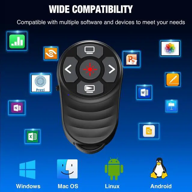 FINGER RING & WIDELY APPLICABLE CLICKER Finger ring concept is unique and practical. You can freely holding a tablet or writing on the board while wearing slide clicker, is real Hands Free! Good size and light weight is suitable for all. Presenter supported systems: Windows 2003/XP/7/8/10 or above/Vista/Mac OS/Linux/Android; Supported software: PowerPoint, iWork (Keynote/Numbers/Pages), Google slides, Prezi, Website etc. A good helper for teacher, tutor, lecturer and speaker