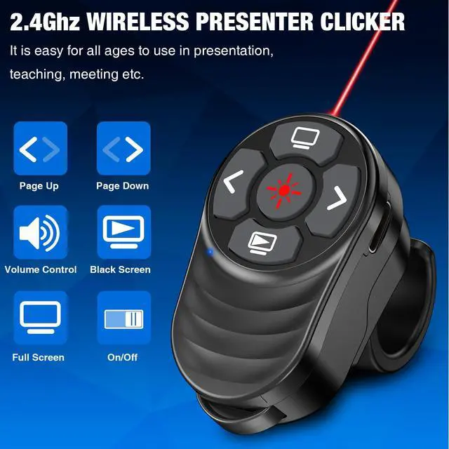 Wireless Presentation Clicker Rechargeable, Finger Ring Powerpoint Clicker with Red Laser Pointer, Presenter Remote PPT Clicker for Powerpoint Presentations for Mac Computer Laptop
