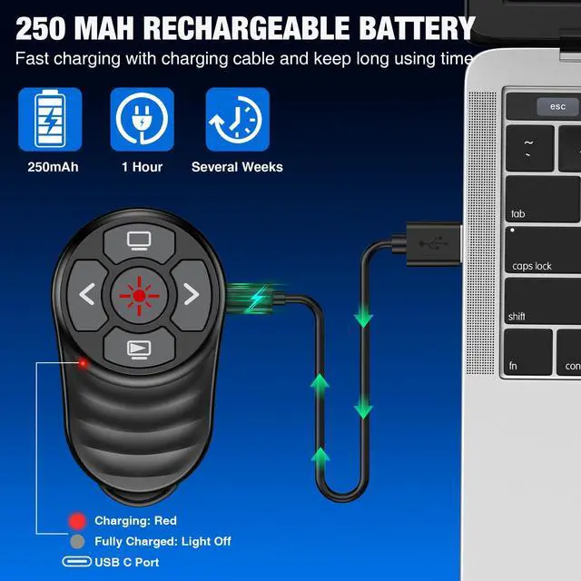 RECHARGEABLE PRESENTATION REMOTE Upgraded silicone button is very soft, comfortable and durable. Presenter remote built-in 250mAh battery and charging cable, charging 1H to provide weeks of use, no need to replace the battery, so you won't miss any important presentations