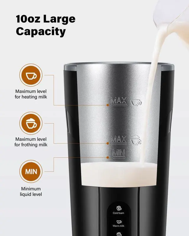Heats up to 10oz (300ml) and froths up to 5oz (150ml), perfect for one cup or multiple servings.