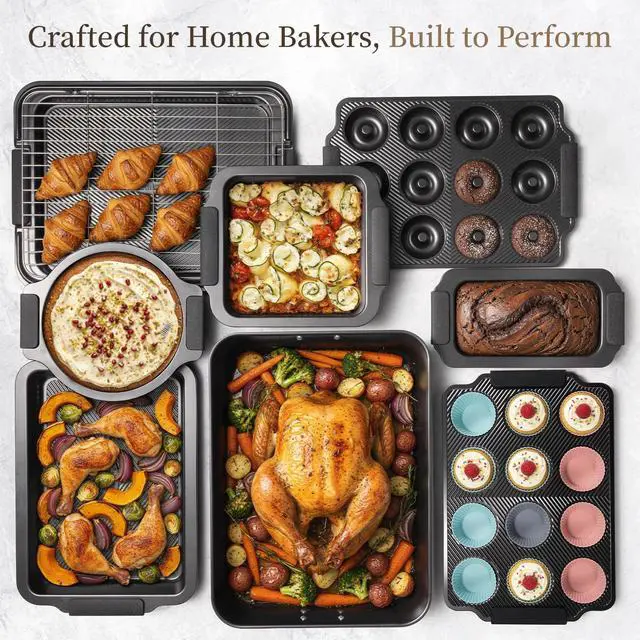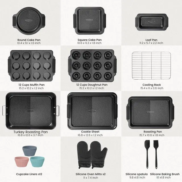 | Included Components | 12 Cups Muffin Pan, 12 Cups Doughnut Pan, Square Cake Pan, 12Pcs Cupcake Liners, Loaf Pan, Round Cake Pan, Cooling Rack, Silicone Oven Mitts, Silicone Spatula Silicone, Baking Brush, Turkey Roasting Pan, Cookie Sheet, Roasting Pan |