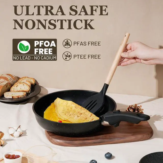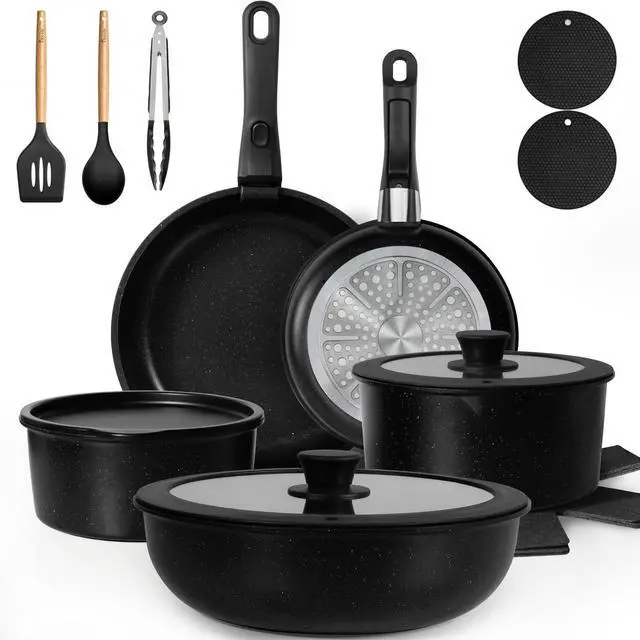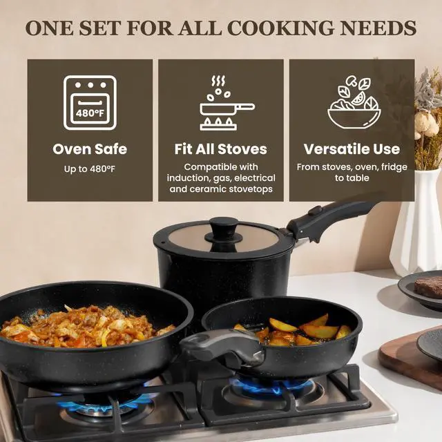 | Included Components | 7" (2 quart) saucepan, 8" (3 quart) saucepan, 8" frying pan, 10" large frying pan, 10" (4 quart) Saute pan, 8" &10" silicone rimmed glass lid, 7"/8" Fridge Lid, 3x silicone Utensils (Slotted Turner&Soup Ladle&Tongs), 4x pot protectors and 2 silicone trivet mat for hot pots and pans |