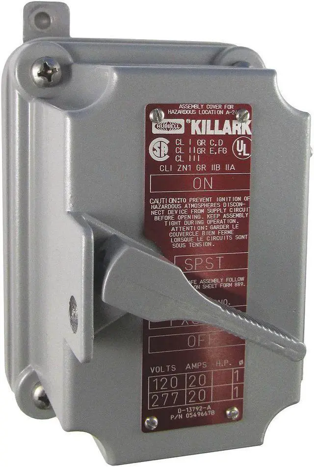 Motor Switch, Number of Gangs 1, Current AC 20 A, Hazardous Location Specification Class I, Div 1 and 2, Group C, D, Class II, Div 1 and 2, Group E, F, G, Class III, Div 1 and 2, Horsepower @ Single Phase - 120V AC 2 hp, Horsepower @ Single Phase - 240V AC 2 hp, Horsepower @ Three Phase - 480V AC 3 hp, Horsepower @ Three Phase - 600V AC 3 hp, Includes Pilot Light Yes, Number of Poles 2, Number of Required Thermals 1, Operator Handle, IP Rating Not Applicable, Phase Single, Starter Style NEMA.