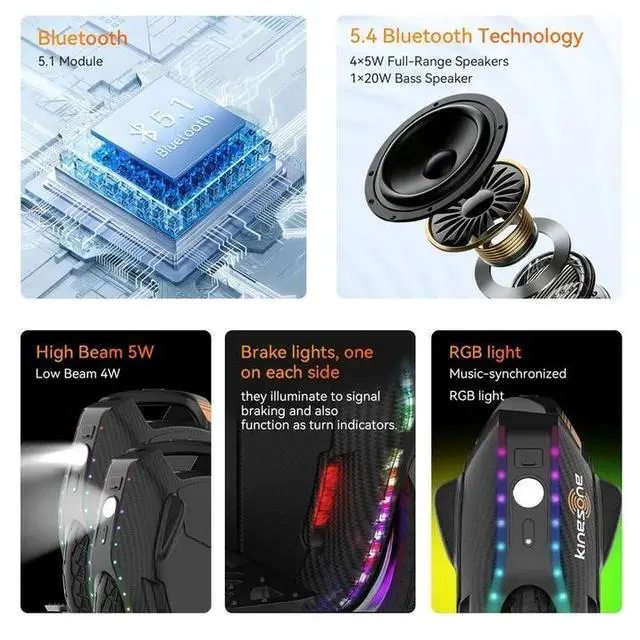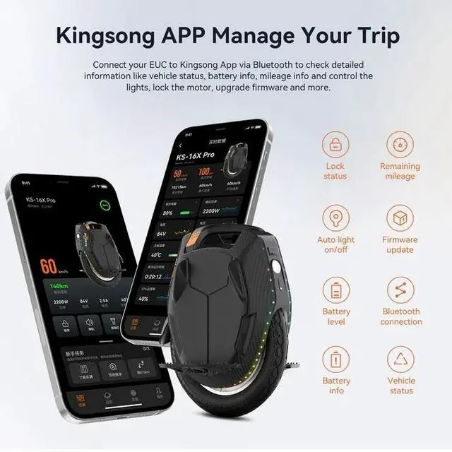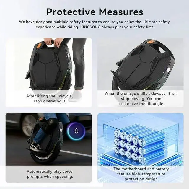 Smart Connectivity & Safety: Connects via Bluetooth 5.1 to the KINGSONG App for real-time monitoring. Compatible with Apple "Find My" for tracking. Features tilt protection, speed alerts, overheat shutdown, and voice warnings.