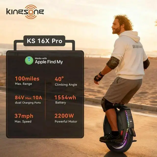 KINGSONG 16X Pro Electric Unicycle for Adults: 2200W Motor Delivers 37 MPH Top Speed & 100-Mile Range. Apple Find My, App Control & Self-Balancing for Ultimate Long-Distance Adventure