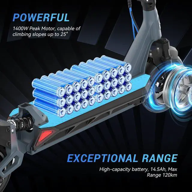 • Powerful Motor & Durable Frame: Driven by a 1000W brushless motor (1400W peak) reaching 31 mph. Features an aviation aluminum alloy frame supporting 266 lbs and 10-inch tubeless tires for stable city and light off-road riding.