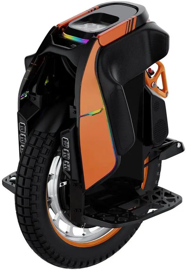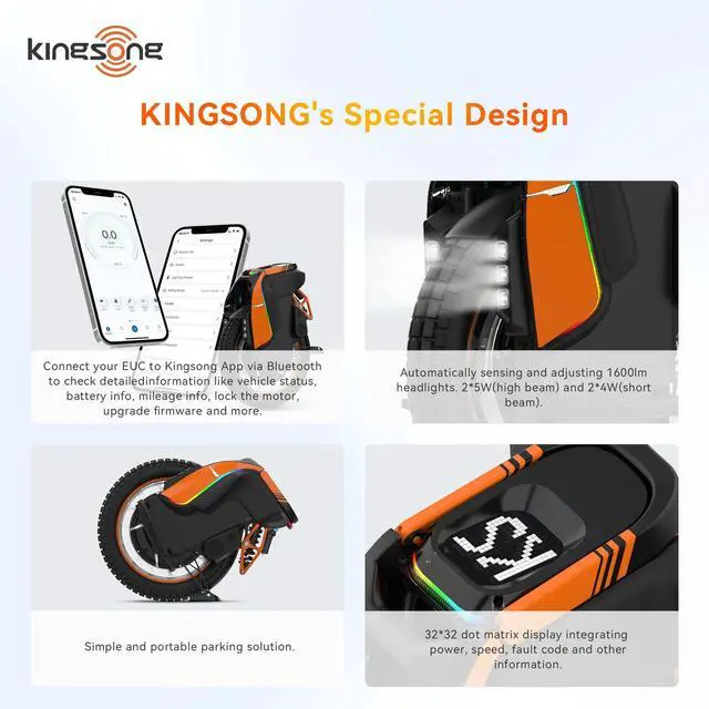 Smart Features & Design: Packed with lift/roll protection, over-speed alerts, and high-temp protection. Includes RGB rear light strip with aurora effects, Bluetooth speakers, adjustable multi-beam headlights, and a 32×32 matrix display. Features anti-slip spiked pedals and silicone-sealed motherboard for weather resistance.