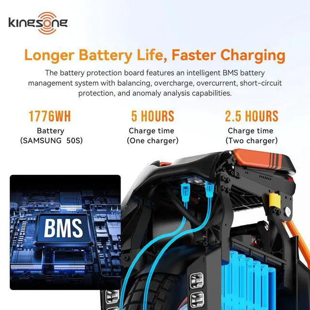 Massive Samsung Battery: Powered by 96 Samsung 50S cells providing 1776Wh capacity for up to 150 km of range. Features smart BMS with multiple protections. Fast 4-5 hour charging with dual charger support cutting time in half.