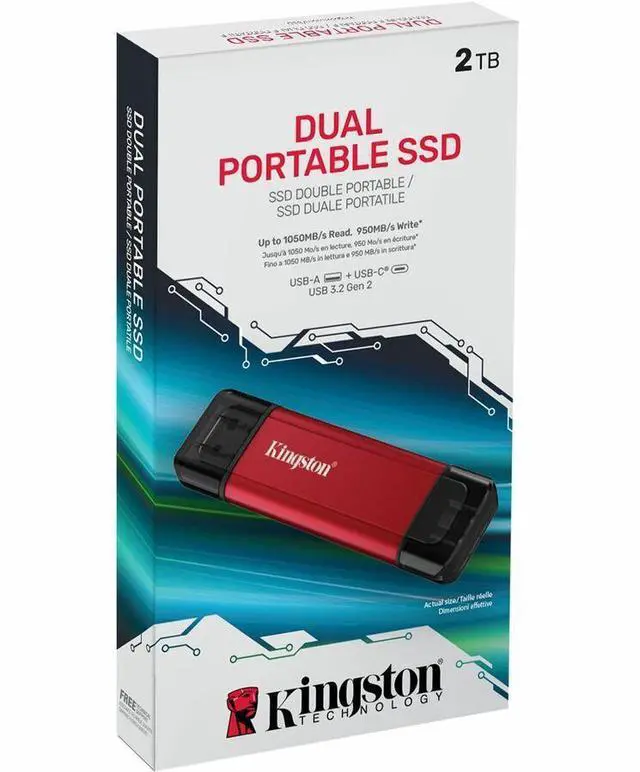 Camouflaged as a traditional thumb drive, Kingston's Dual Portable SSD brings stunning USB 3.2 Gen 21 performance to your USB Type-A and USB-C®2 devices.