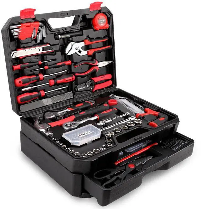 [Toolbox Included] - Includes 1-Drawer storage box with independent sliding drawer to enlarge the capacity more than common toolbox. Assortment of necessary tools are in one tool chest, durable plastic case with internal molded compartments to keep each component protected and easily accessible. All tools meet or exceed ANSI standard.