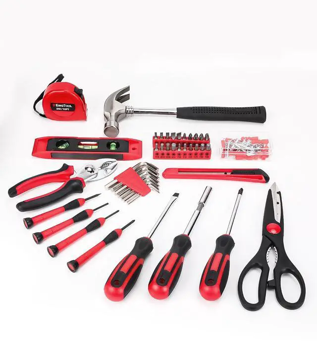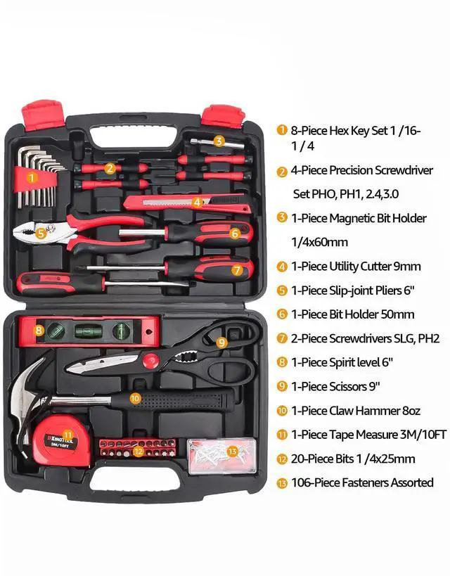 [Complete Varieties] - 8 pieces hex key set, precision screwdrivers, hammer, tape measure, pliers etc. The bit holders, 9mm utility cutter, scissor and 106 pieces fasteners. Variety of 1/4-inch screwdriver bits: Phillips, slotted, square, star and pozi. Soft-grip handle on screwdrivers, pliers and hammer provides excellent comfort and control.