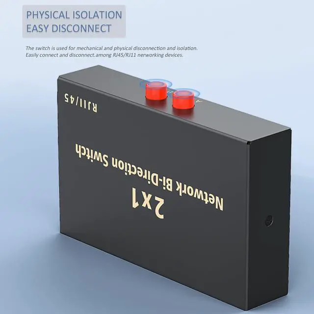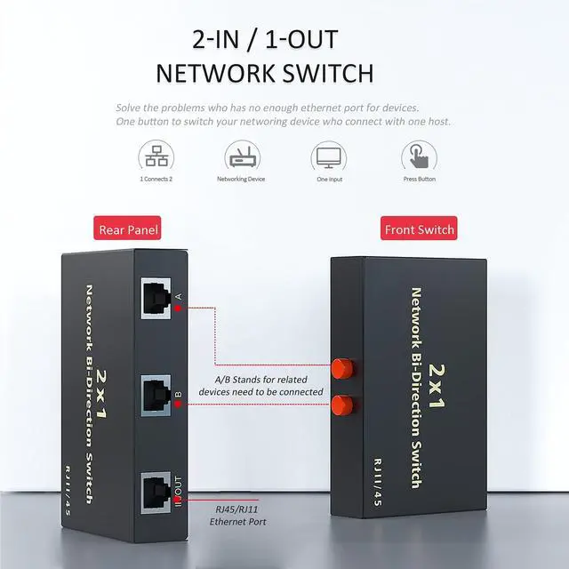 - A/B Switch: The box can be used with Network Devices or 8 wire phone applications. Use as 1 in 2 out or 2 in 1 out.