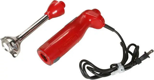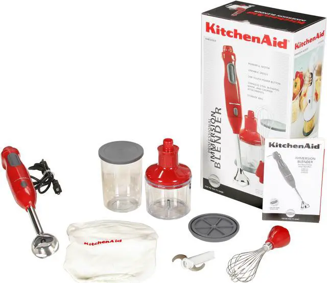 | Features | Blend, whip and chop using this one, hand-held appliance. Equipped with a powerful motor and a durable attachment that features a premium stainless steel blade, the KitchenAid immersion blender churns to the bottom of tall pots and pitchers with ease. The 5-ft. long power cord provides exceptional freedom. The immersion hand blender comes with a stainless steel attachment for blending everything from cold beverages to hot soups. The attachment measures 8-inches - perfect for blending inside deep stockpots or tall bar blender jars. A stainless steel splashguard covers the blending blades to help prevent splatters. Turn the immersion blender into a mini chopper and quickly chop herbs, vegetables, fruits, cooked meats, nuts and cheese with the four-piece attachment. It includes an adapter, stainless chopping blade, 3-cup chopper bowl and nonskid base that doubles as a lid for the bowl. Also included is a whisk attachment for whisking fluffy egg whites or whipped cream and a machine-washable, cotton twill, drawstring bag for storing. The accessories that come with your KitchenAid immersion blender are dishwasher-safe. |