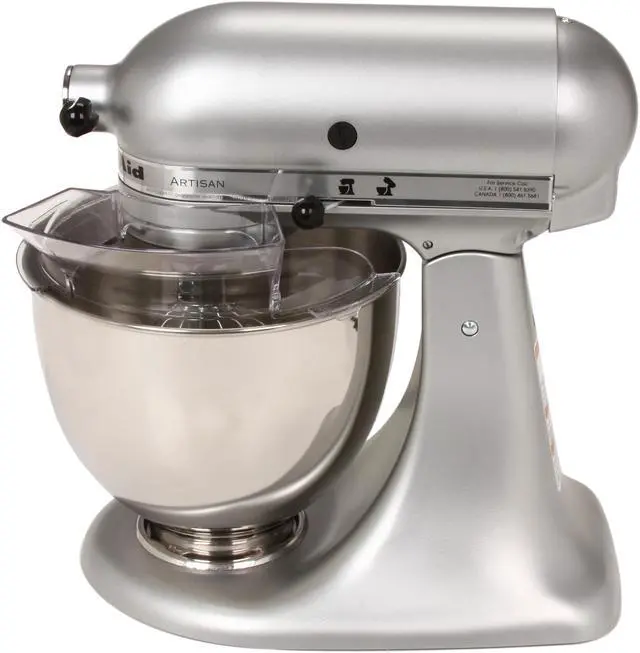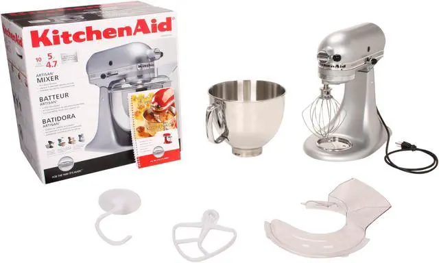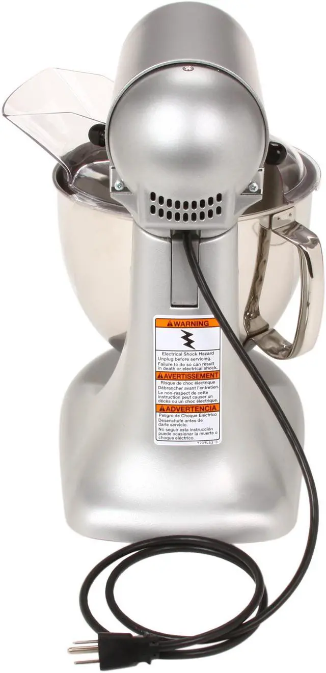 Tilt-Head Design 10-Speed Slide Control 5 Qt. Stainless Steel Bowl Planetary Mixing Action 325 Watt Heavy-Duty Motor Multipurpose Attachment Hub Dishwasher Safe Attachments Includes Flat Beater, Dough Hook, Wire Whip Includes One Piece Pouring Shield Silver Finish