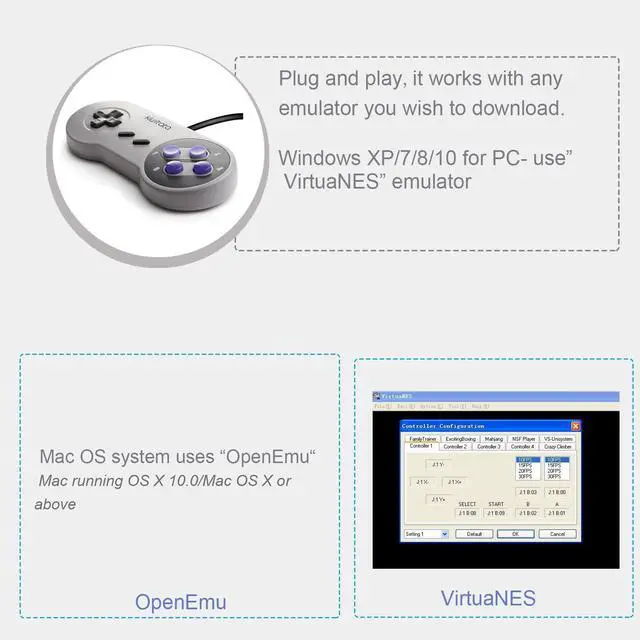 Open Emulator-Option-Controller-Controller Settings (Select Default Setup base) Map usb controller' buttons D-padSELECTSTARTBAXY button -- define- confirm Choose Emulator Rom file( game) -START-Play computer games