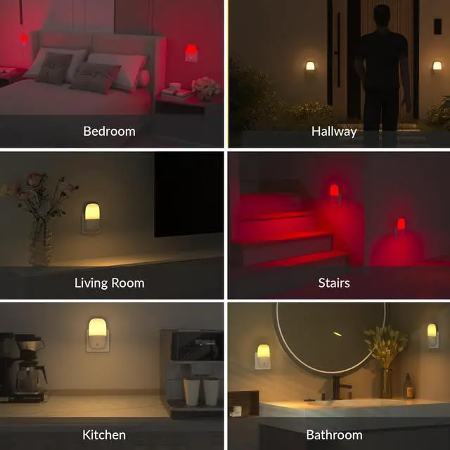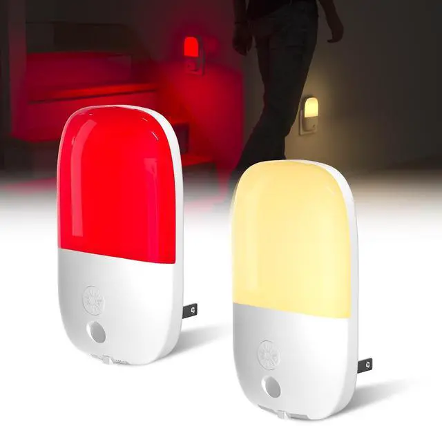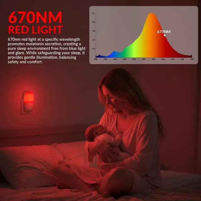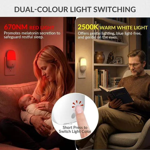 Dual-Colour 670nm Red Light and Warm White Light: LED night light is equipped with two colours. 670nm red light emits zero blue light radiation and promotes melatonin secretion, thereby enhancing sleep quality to help you fall asleep faster, sleep more deeply, and enjoy better rest. 2500K warm light provides soft night illumination. The light colours can be easily switched at the touch of a button