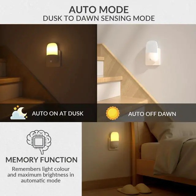 Smart Auto Dusk-to-Dawn Sensor with Memory: Set the switch to AUTO for intelligent, hands-free operation. The built-in light sensor automatically turns the light ON at dusk and OFF at dawn, saving energy. In auto mode, plug-in night lights remembers the last light colour and brightness level you selected, ensuring a consistently convenient experience