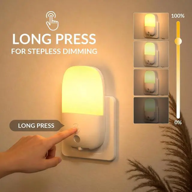 One-Touch Control & Dimmable: A short press on the nightlight front button toggles between red and warm light. Press and hold the same button to smoothly adjust brightness from 0% to 100%, allowing you to set the perfect ambiance for any scenario