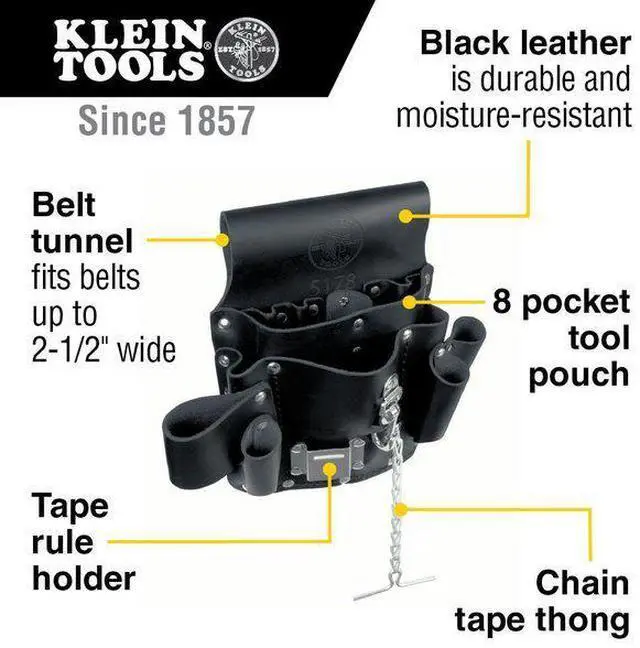 California Proposition 65: This product contains a chemical known to the State of California to cause birth defects or other reproductive harm. The Klein Tools 8-Pocket Tool Pouch is a roomy pouch for electricians, service techs, and maintenance workers. Five large utility pockets and three pockets for screwdrivers and plier make this a handy pouch for everyday tasks. Fits belts up to 2-1/2-Inch wide. Soft, pliable, black leather is durable and moisture-resistant. Soft, pliable, black leather is durable and moisture-resistant. Roomy pouch for electricians, service techs, and maintenance workers. Five large utility pockets and three pockets for screwdrivers and pliers.. Tape rule holder on the front. Fits most belts up to 2.5 -Inch ( 6.4 cm) wide. Riveted and stitched for extra durability. Heavy-duty chain tape thong securely fastened with a rivet. Made in the USA.. This item has been restricted from sale in the following state (s): []