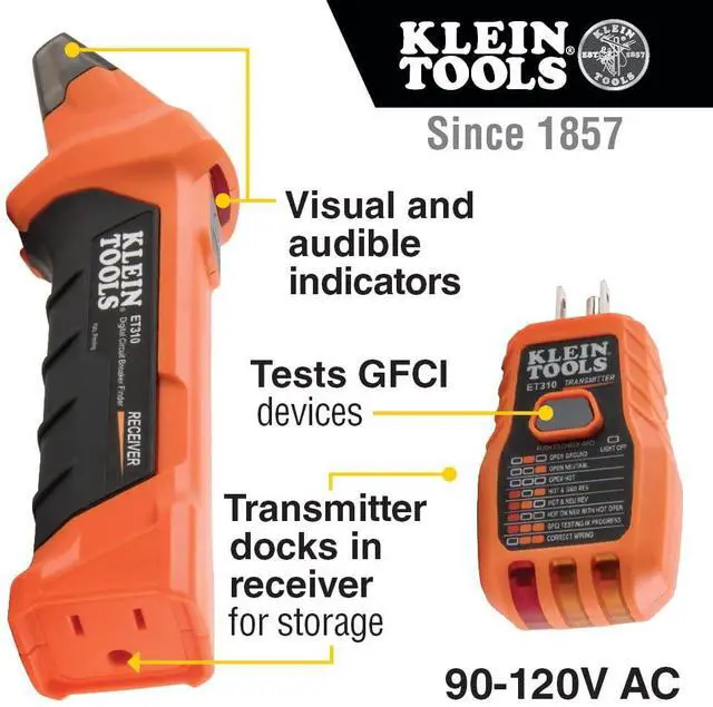 The Klein Tools ET310 Circuit Breaker Finder with Integrated GFCI Outlet Tester is a digital circuit breaker finder used to locate the correct circuit breaker in a panel to which an electrical outlet or fixture is connected. The Transmitter is connected to the electrical outlet or fixture in the circuit while the receiver is used to scan the breakers in the circuit panel. The Transmitter also features a GFCI outlet tester.