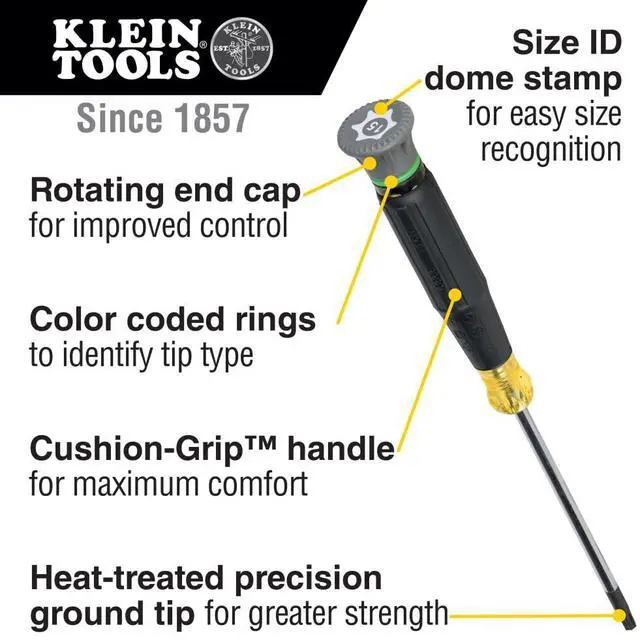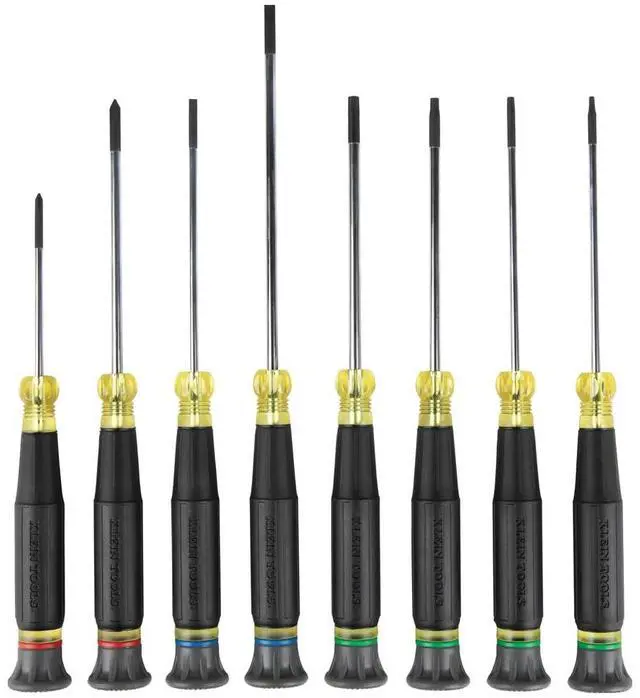 Klein Tools 8-Piece Precision Screwdriver Set helps get the job done when precision is key. These tools have all the quality and standards of full size screwdrivers with precise finger control for turning blades in tight spaces. This set includes 2 flat tip screwdrivers, 2 Phillips screwdrivers and 4 TORX screwdrivers.