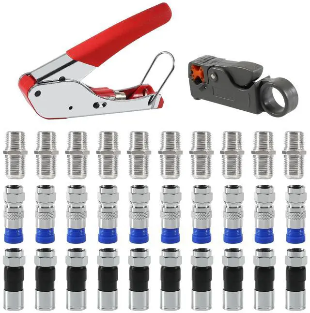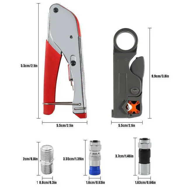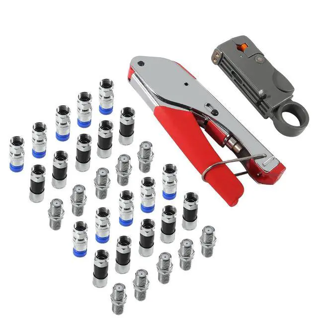 Package Contents: Compression Tool Kit Including 1pc Rotary Coaxial Cable Cutter Tool,1pc Coaxial Cable Crimper and 30pcs Connectors. Portable Size, Handle Made of the Special Soft Material, Non-Slip, Comfortable to Use, Feel Strong