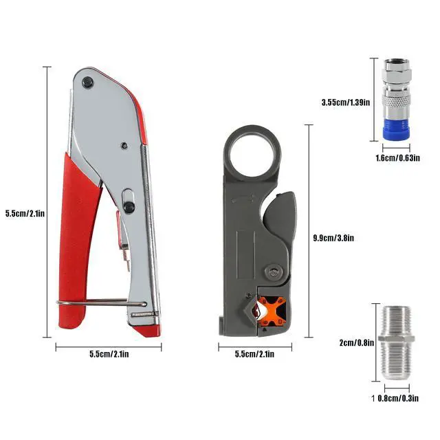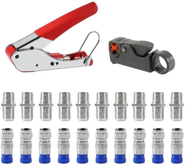 Package Contents: Compression Tool Kit Including 1pc Rotary Coaxial Cable Cutter Tool,1pc Coaxial Cable Crimper and 20pcs F Compression Connectors. Portable Size, Handle Made of the Special Soft Material, Non-Slip, Comfortable to Use, Feel Strong