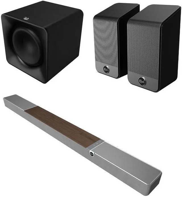 Klipsch FLEXUS-300-SOUNDBAR 5.1. 2 Dolby Atmos Sound Bar - 2 x 2.25" Side Firing Drivers - 4 x 2.25" Front Firing Drivers - Full Range - Max Acoustic Output of 106dB - HDMI eARC Supported - Bluetooth - Remote Control Included - (54"W x 5"D x 3"H) - (Walnut) with Klipsch FLEXUS-20-SUB Compact Wireless 12" Subwoofer - Frequency Response 26Hz - 250Hz - 12" Woofer - Class D Amplifier - Simple Setup - Low Latency - Booming Bass - Sleek Style - Max Acoustic Output of 103.7 dB - 1 USB-A Input - ( 15.25"W x 15.25"D x 15.25"H )