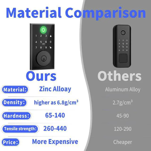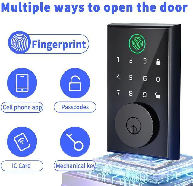 With 5 in 1, multiple choices to unlock your door:This smart door lock offers an impressive unlock options in 5:fingerprint recognition, Bluetooth-enabled mobile app control, personalized passcodes, door card, mechanical keys. Enjoy the freedom to choose the unlocking way that the best suits your preferences.