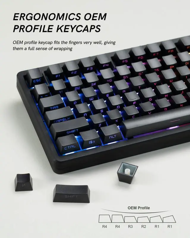 - With R1–R4 sculpted rows, these keyboard caps follow the natural curve of your fingers, offering effortless comfort for work or gaming sessions.
