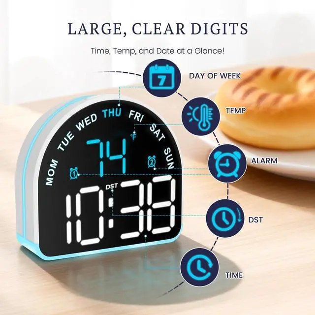 Daylight Saving Time & Practical Features Simple daylight saving time setting. Ideal for bedside, office, or kitchen use with clear LED digits and user-friendly controls.