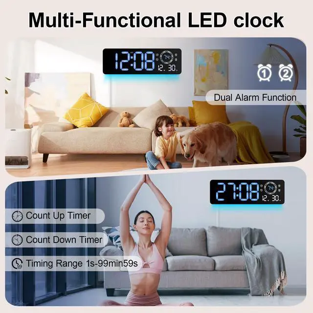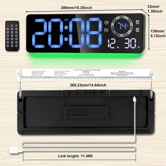 Large 16-Inch LED DisplayFeatures a wide 15.28-inch by 5.21-inch screen with 3.92-inch extra-large digits, clearly showing time, date, day, and temperature. Designed for easy reading from any angle and distance, ideal for the elderly or those with low vision.