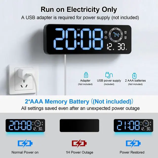 Plug-in Only with Memory BackupMust be powered using the included 11.5 ft cable and USB-C adapter (not includedcannot operate on batteries alone). Battery compartment (for 2 AAA batteries, not included) serves as memory backup during power outagesno need to reset after power resumes.